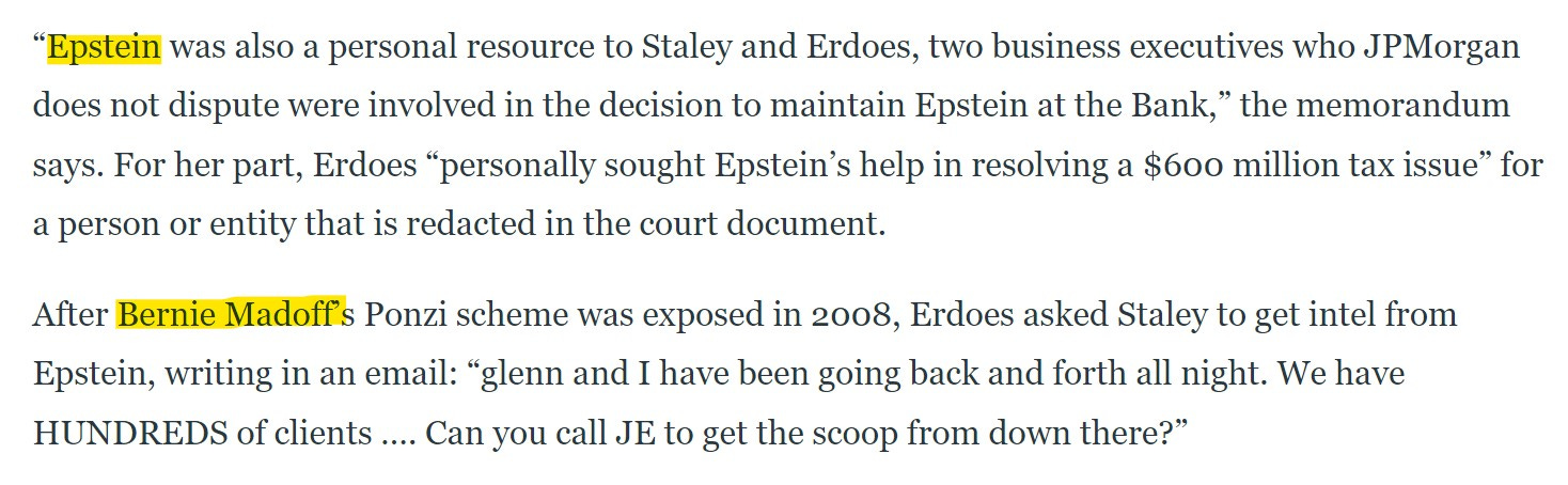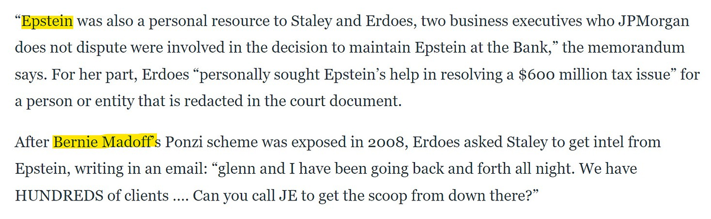 As I sit here working on wrapping up Part Three of my Jarecki Family Secrets series, I found myself re-reading internal email exchanges between JPMorgan Chase top-level executives Mary Erodes and Jes Staley. These were included in the lawsuit brought against the banking giant by the U.S. Virgin Island who slammed them for aiding in Jeffrey Epstein’s sex trafficking.